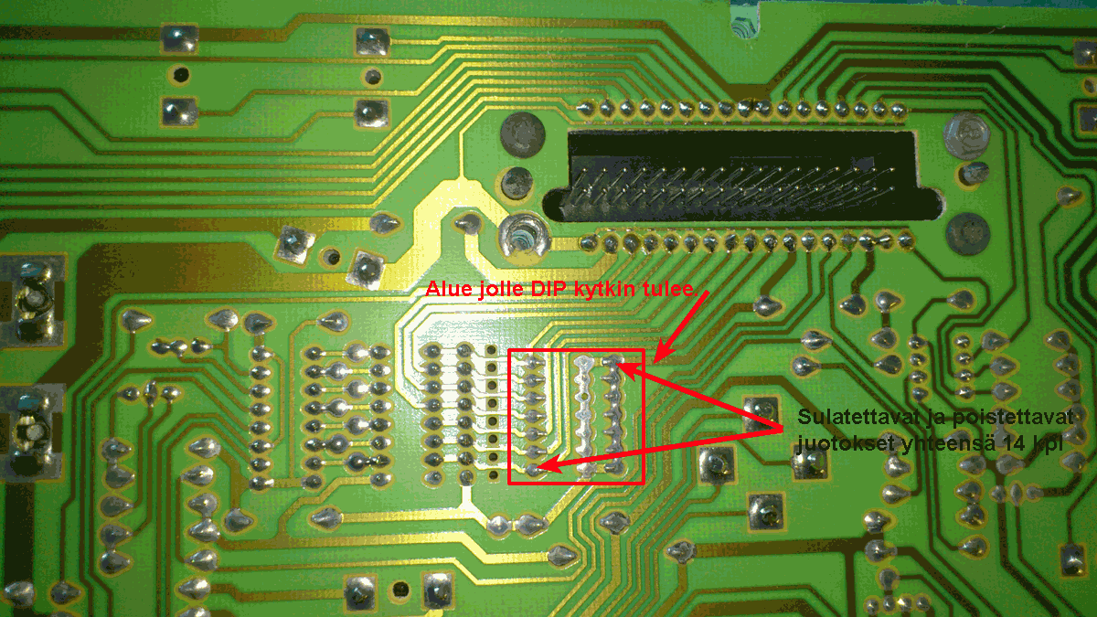 Mittaa vastusmittarilla mitkä hyppylangat johtavat ja mitkä eivät ja kirjoita muistiin jos tarvitset tietoa mahdolliseen palautukseen. Eli esim. F301 on ylin lanka joka jää siten kuin se on....eli sen kuuluisi johtaa. Mittaa hyppylankojen molemmista päistä vastusmittarilla johtaako vai onko poikki. Sulata tina varovasti piirilevyltä hyppylankojen reikien kohdalta ja imeytä esim. kuparisukkaan tai poista sitä muuten niin, että reiät ovat vapaat ja sen jälkeen paina DIP kytkimen liitin nastat reiistä läpi. varo taivuttamasta piirilevyä ja muista staattisen sähkön vaarat sille eli huolehdi maadoituksista. Juota DIP kytkin kiinni piirilevyn siltä puolelta jonne sen nastat tulivat läpi.