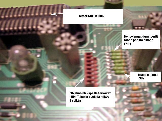 Nopeusmittarin poiston jälkeen näkyvät ohjelmointi komponentit 7kpl. Mittaa vastusmittarilla mitkä hyppylangat johtavat ja mitkä eivät ja kirjoita muistiin jos tarvitset tietoa mahdolliseen palautukseen. Eli esim. F301 on ylin lanka joka jää siten kuin se on....eli sen kuuluisi johtaa. Mittaa hyppylankojen molemmista päistä vastusmittarilla johtaako vai onko poikki.