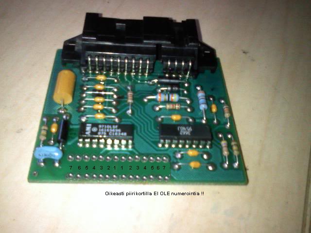 yksikössä on kaksi paikkaa hyppylangoille ja niitten numerointi lähtee keskeltä ulospäin muodossa 7654321-1234567. Eli mukana on ns."käänteinen" numerointi. Piirikortilla EI OLE numerointia - ainoastaan kuvassa!! Ovat toistensa peilikuvat.