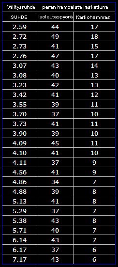 Katso laskemasi uuden välityksen hyppylankojen paikat taulukosta lähimmän saamasi arvon mukaan ja asenna sopivan paksuiset uudet langat paikoilleen ja tinaa ne piirilevyn takapuolelta.