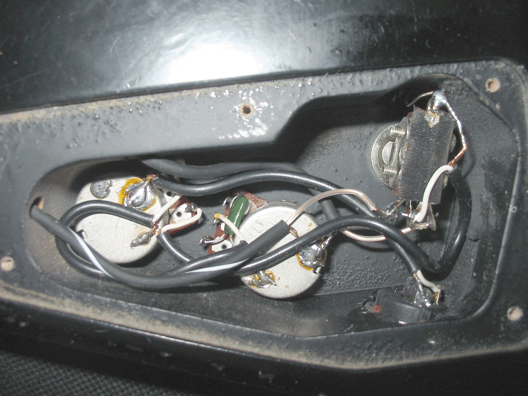 Vasemmalla kuva johdotuksesta Riverhead kitaran sisältä. Potentiometrit ovat 500 ohm/kpl. Kondensaattori 22nF. "gnd" merkitty johto menee porausta pitkin alatallan alle maadoittaen sen ja kielet. |
