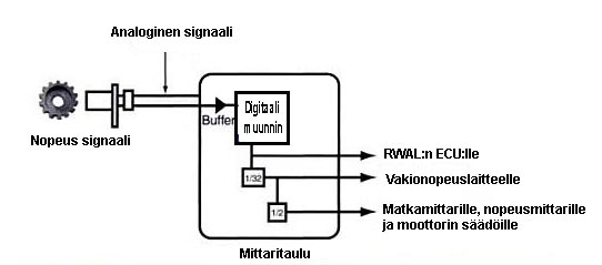 Gm:n vaihteistosta sen takaosasta nopeustunnistimelta (VSS - Vehicle Speed Sensor) tulee vaihtovirta signaali ( AC) ja se muutetaan mittaritaulun takana olevassa (ennen 1990) tai erillisessä DRAC / VSSB(Digital Ration Adapter Controller/Vehicle Speed Sensor Buffer) moduulissa kalibroiduksi tasajännitteeksi ja prosessoidaan ennen lähettämistä eteenpäin Rwal Eculle/ CruiseControlille/ nopeusmittarille/ ECM:lle.
