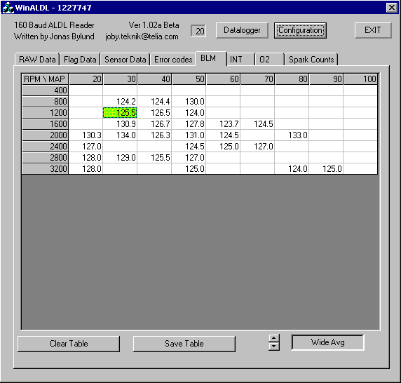 Nämä kolme taulukkoa näyttävät samoilta. siellä on ruudukko RPM ja MAP akseleille. Kun ohjelma käynnistetään ovat ruudut tyhjiä. Kun moottori käy sen toimintapisteistä kerättyä tietoa kulkee vasemmalta oikealle ruudukolla. O2 (happitunnistin) alkaa toimia heti, mutta INT ja BLM vasta kun moottori on käyttölämpötilan saavuttanut (closed loop). Alhaalla on jälleen nappi josta voit tyhjentää ruudut tai toisesta tallentaa ruudukon tiedot. Taulukko tallentuu samaan tiedostoon ohjelman kanssa, ja tallennetun tiedoston nimi ilmoitetaan ruudussa. Alhaalla on myös aukko jossa voit nuolilla valita yhden seuraavista toiminta muodoista: