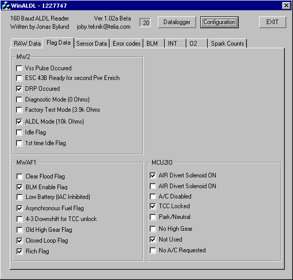 Tässä ikkunassa on useita ruutuja joissa ilmaistaan onko saatava tieto totta vai ei. Tässä voit nähdä esim. onko kone saavuttanut käyttölämpönsä (closed loop) jolloin pienessä aukossa on ruksi .Voit myös nähdä digitaalisen sisään menon ja ulostulon (ALDL mode).