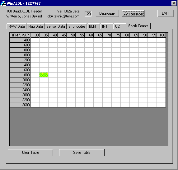 Tässä on akselit RPM:lle ja MAP:lle. Kun ohjelma käynnistetään kaikki ruudut ovat tyhjiä.Milloin tahansa koneessa havaitaan nakutus (ennenaikainen sytytys) ruudulla oleva arvo lisääntyy yhdellä koneen tässä toiminta pisteessä. Tällä löydetään toiminta pisteet joissa nakutusta esiintyy . Alhaalla on jälleen painonappi jolla voi aloittaa uudelleen ja nappi jolla voi tallentaa näkyvät toiminta arvot. Taulukko tallentuu samaan tiedostoon ohjelman kanssa, ja tallennetun tiedoston nimi ilmoitetaan ruudussa.