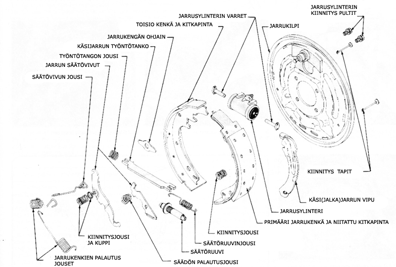 Huomaa, että vasemmanpuolen jarrukenkien ollessa kauempana rummun kehältä vaijerin oikealla puolella tapahtuvan liikkeen alkamispaikka siirtyy myöhemmäksi. Eli vasemmanpuolen jarrun on myös oltava säädettynä lähelle kehää koska oikea puoli alkaa liikkua vasta kun vasen alkaa (kunnolla) ottaa kiinni......ja lopuksi hajoituskuva takajarrujen osista.