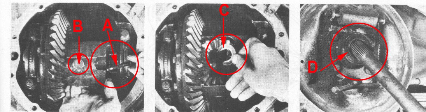 Kun taka-akselin öljyt ovat valuneet ulos voit poistaa lukituspultin [A] joka sitoo koko paketin nippuun; Pienten tasauspyörästön hammasrattaiden akseli[B] tulee sen jälkeen vetämällä ulos. Hammasrattaiden akselin ulosveto taasen aiheuttaa sen, että voit työntää vetoakselia sisään päin jolloin vetoakselin tasauspyörästön puoleisesta päästä irtoaa akselin lukituslevy [C].( Lukituslevy kestää paikallaan omassa kolossaan kun akselia vedetään ulospäin ja pienten hammaspyörien akseli on on paikallaan. Lukituslevy irtoaa kun pienten hammaspyörien akseli irroitetaan ja akseli työnnetään kohti tasauspyörästöä.) Vetoakseli on nyt irti ja voit vetää sen ulos.